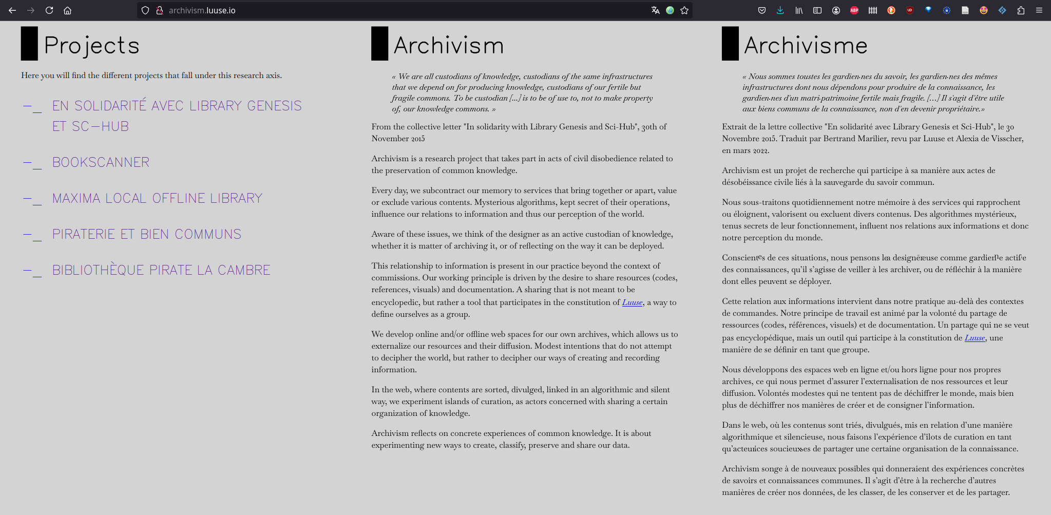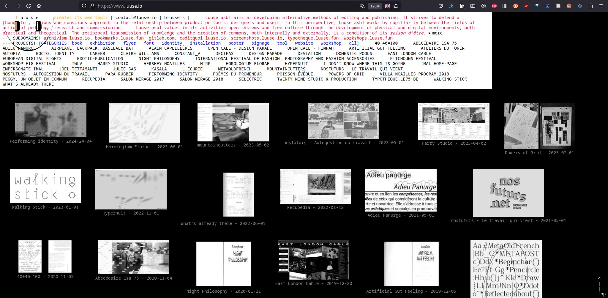 Luuse vise à développer des méthodes d'édition de forme et de publication alternatives. Elle s'attache à défendre une approche réfléchie, curieuse et consciente des relations entre outils de publication, designer·euses et utilisateur·ices. Dans cette optique, Luuse asbl œuvre par capillarité entre les champs d'action de la pédagogie, de la recherche et de la commande.